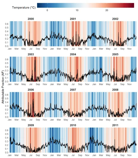 Sharp spikes in AF exceeding 60% are visible in summer 2003 and 2006, coinciding with the major European heatwaves. In general, summer episodes produce higher and more abrupt peaks in AF, whereas cold winter days are associated with more sustained elevations over time, though less pronounced in magnitude.