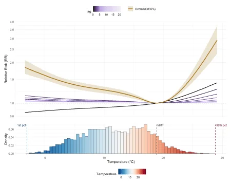 The overall cumulative curve (mustard) is clearly asymmetric: risk increases on both sides of the MMT, but the rise is much steeper for hot temperatures than for cold temperatures. The lag-0 curve (black), which reflects the immediate effect, behaves differently for cold than heat: it is below 1 at cold temperatures (reflecting the delayed nature of cold temperature effects) and increases approximately linearly for heat. The histogram confirms that most London days fall between 5°C and 20°C, so extreme temperatures, despite their high individual risks, are relatively rare events.